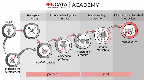 The successful startups receive funding for engineering prototype development with the engineering catalyst EnCata and go through the 4-week acceleration program. Moreover, B2C-focused hardware startups get funding for a turn-key Kickstarter campaign.